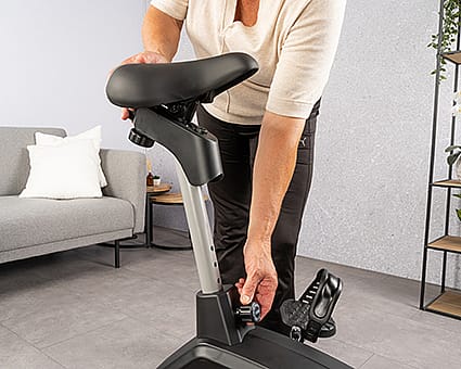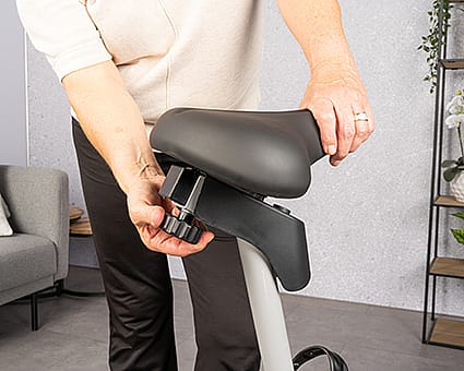 The saddle should be height-adjustable so that your knees remain slightly bent when the pedals are at their lowest point. On some exercise bikes, it is also possible to adjust the saddle horizontally, giving you an extra option to achieve the perfect seating position. It is also useful if the handlebars are tiltable, allowing you to adjust them to match your posture.